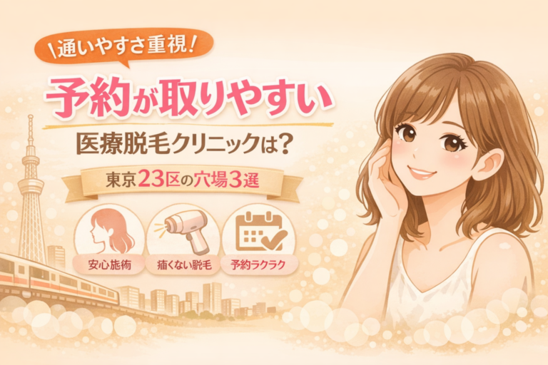 医療脱毛を始めるうえで、「予約の取りやすさ」は最重要ポイント。 どれだけ料金が安くても、予約が取れずに施術間隔が空いてしまうと、効果が出るまでの期間が長引いてしまいます。 この記事では、東京23区の中でも 予約が取りやすい仕組みがある 駅チカで通いやすい 営業時間が長く、仕事帰りでも通える といった“穴場クリニック”を厳選して紹介します。 1. 予約が取りやすいクリニックを選ぶポイント ✔ 予約の […]