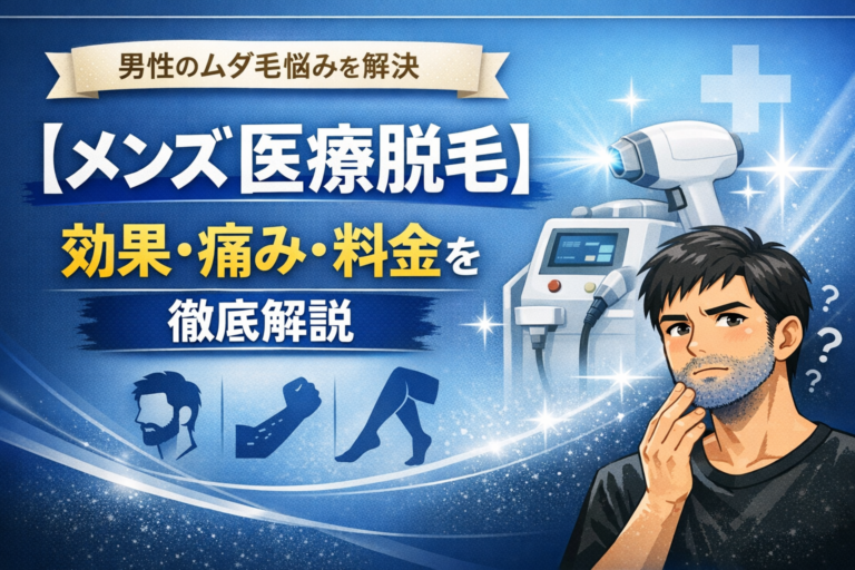 男性のムダ毛の悩みは年々増えており、ヒゲ・全身・VIOなど、医療脱毛を選ぶ男性が急増しています。 本記事では、メンズ医療脱毛の効果・痛み・料金をわかりやすく解説し、初めての方でも安心して検討できるようにまとめました。 1. メンズ医療脱毛とは? 医療脱毛は、医療機関でのみ扱える高出力レーザーを使用し、毛根を破壊して永久脱毛効果を得る施術です。 メンズ脱毛が人気の理由 ヒゲ剃りの手間が激減 青ヒゲが […]